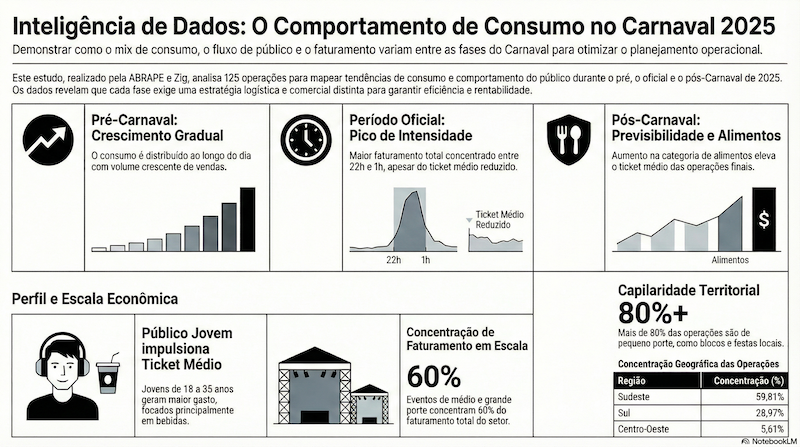 A Associação Brasileira dos Promotores de Eventos (ABRAPE) divulgou um estudo inédito desenvolvido pela Zig, empresa de tecnologia especializada em soluções para o setor de entretenimento ao vivo. O levantamento analisa tendências de mix de consumo, comportamento do público e organização operacional ao longo do pré-Carnaval, do período oficial e do pós-Carnaval de 2025, a partir de dados coletados em 125 operações realizadas em diferentes regiões do país.