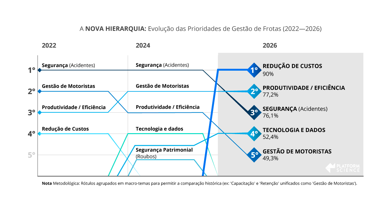O setor de transporte e logística no Brasil passou por uma mudança em 2025, segundo a 5ª edição do Guia sobre Tendências de Gestão de Frotas e Logística, pesquisa conduzida pela Platform Science. O levantamento aponta que empresas do setor deixaram de priorizar apenas um fator operacional e passaram a exigir, de forma simultânea, redução de custos, aumento de produtividade e segurança.