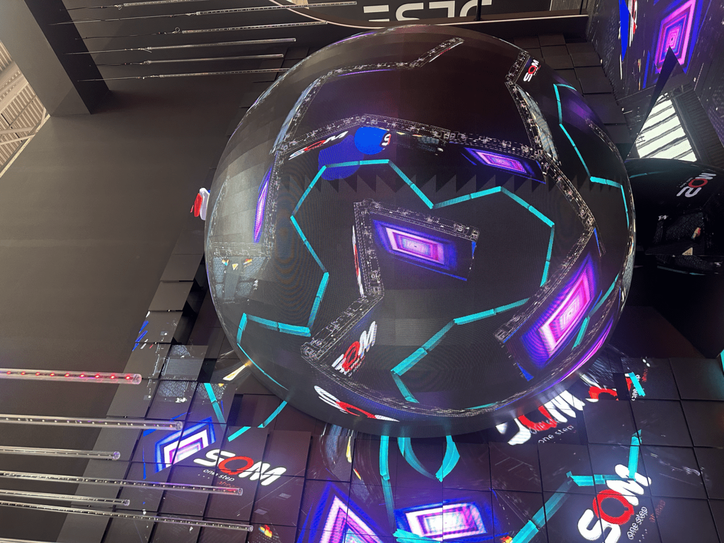 A feira também apresentou soluções baseadas em interatividade e mídia digital. A empresa SQM exibiu uma instalação composta por painéis móveis que criavam padrões visuais dinâmicos, além de uma esfera com projeção interativa controlada por gestos.