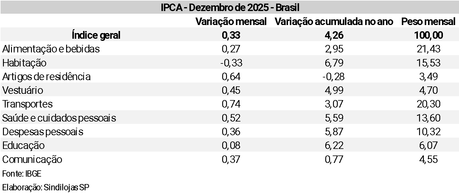 Segundo análise do Sindilojas SP, o comportamento mais favorável da inflação no segundo semestre foi determinante para que o índice acumulado em 12 meses recuasse da faixa de 5,50% para 4,26%, retornando ao intervalo da meta perseguida pelo Banco Central do Brasil, cuja referência é de 3% ao ano, com tolerância de 1,5 ponto percentual para cima ou para baixo.