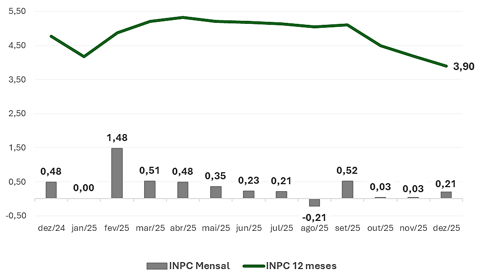Em dezembro, o INPC avançou 0,21% e encerrou o ano com variação acumulada de 3,90%. O indicador mede a inflação para famílias com rendimento de até cinco salários mínimos e reforça a leitura de um cenário inflacionário menos pressionado no fim de 2025.