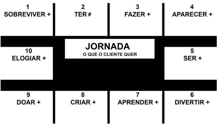 O primeiro mapa — o da jornada do cliente — traduz o que as pessoas realmente querem viver quando escolhem produtos, serviços ou experiências.Essa jornada é composta por dez estágios de desejo, que funcionam como um “mapa do comportamento humano” diante do consumo.