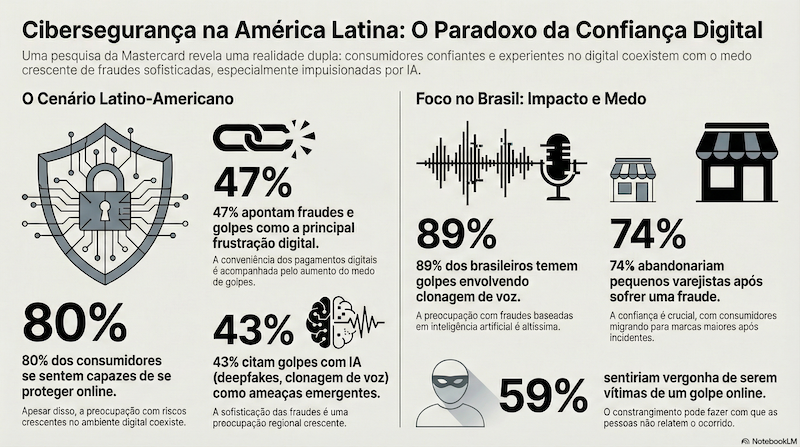 A Mastercard divulgou os resultados de sua mais recente pesquisa regional sobre percepção de cibersegurança na América Latina e no Caribe. O levantamento aponta que, com a consolidação dos pagamentos digitais e o aumento da conveniência, cresce também a preocupação dos consumidores com fraudes e golpes, especialmente aqueles impulsionados por tecnologias de inteligência artificial, como deepfakes e clonagem de voz.